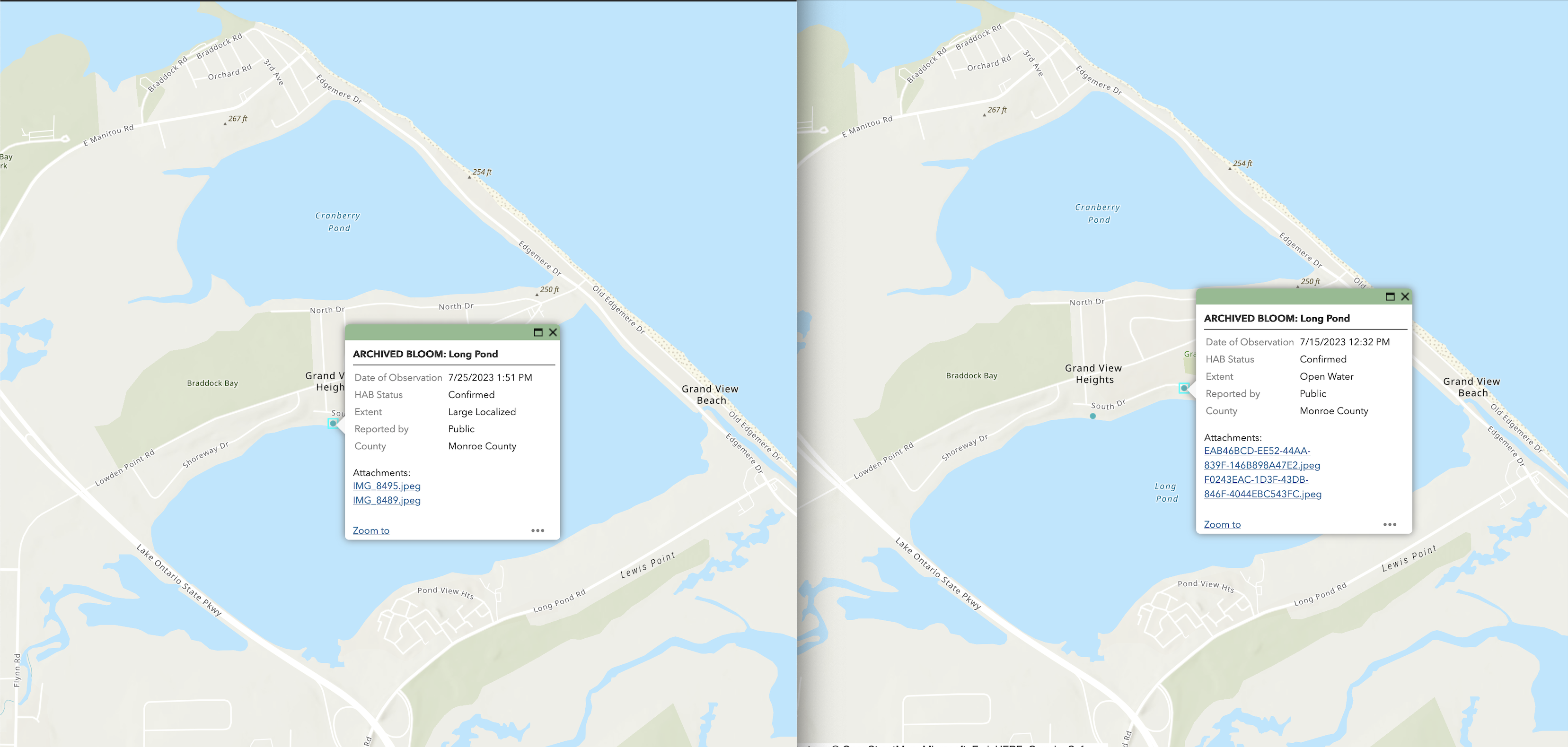 “At about 7 AM this morning (7/10/25), Tim Smith and I spotted fresh harmful algal blooms (HABs) along the north shore of Long Pond. We filed reports with photos and reached out to a SUNY Brockport professor, who sent three grad students later that day. They collected water samples from across Long Pond for research comparing conditions here with Cranberry Pond and Braddock Bay. One student will focus her thesis on Long and Cranberry Ponds — including the creek that flows through the old dump into Long Pond. She had no idea about the dump and was surprised to hear it. The research team plans to keep us updated as their findings develop.”